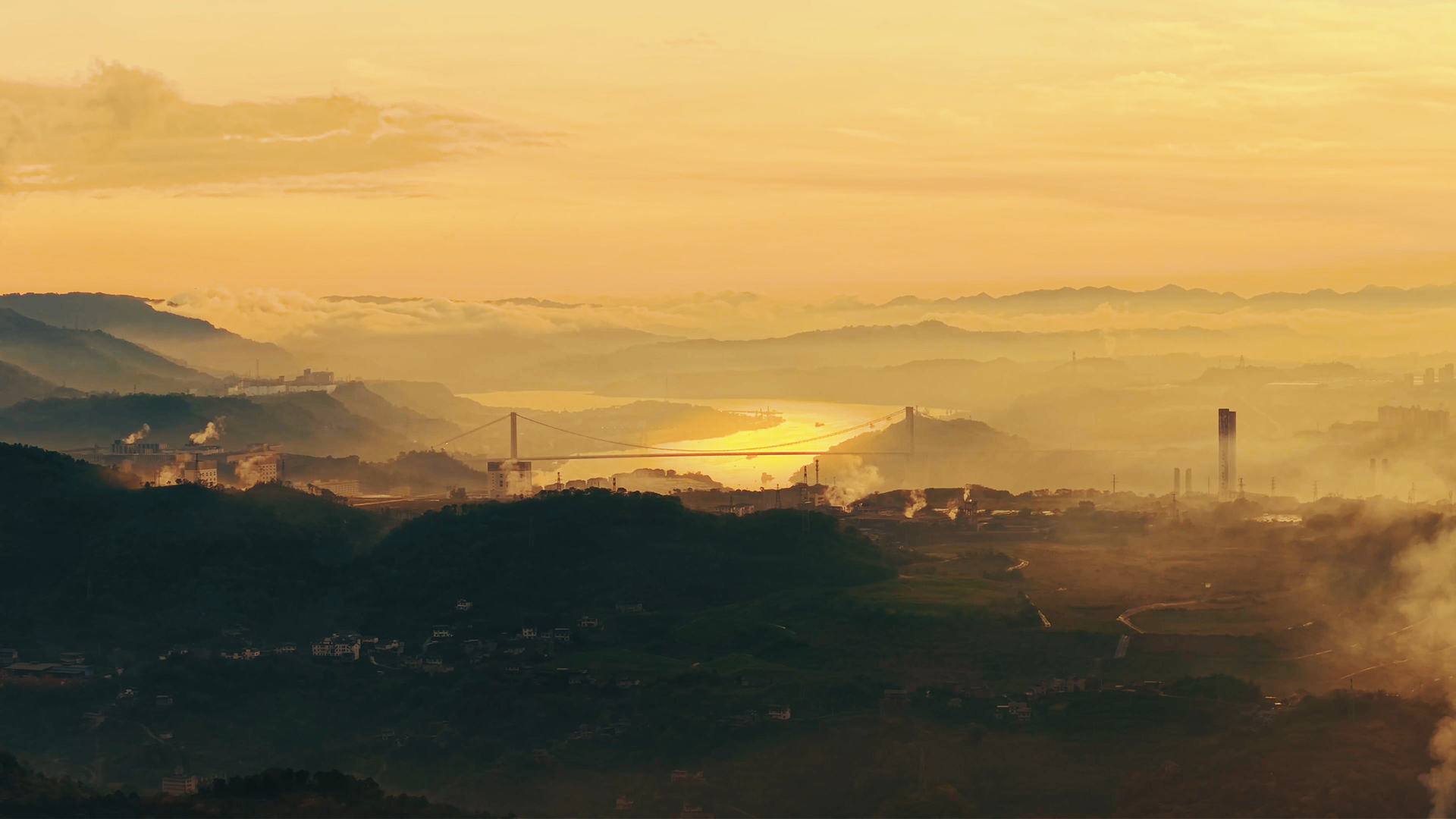 4月14日傍晚,雨后初霁,涪陵城市上空上演美丽的光影大戏。无人机航拍视角下,天空与楼宇被镀上一层金色,天空是金色晚霞与云雾交织,如流金泼洒。