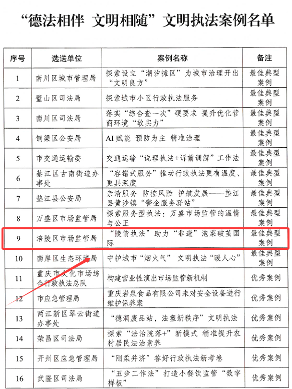 <p style="text-indent:2em;">近日,重庆市委宣传部、市委文明办、市司法局公布“德法相伴 文明相随”文明执法典型优秀案例名单,涪陵区市场监管局的《“陵情执法”助力 “非遗”泡菜破茧国际》成功入选最佳典型案例。这一案例生动展现了涪陵区市场监管局持续优化营商环境,以有温度的执法推动经营主体健康发展,助力地方特色产业腾飞的创新实践。</p><p style="text-indent:2em;"> </p><p><img style="height:auto !important;" src="https://imagecdn.cqliving.com/images/app_16/cms/202508/cd5f0b08602c4888a394743df8994f79.png"></p><p>涪陵区市场监管局申报的《“陵情执法”助力“非遗”泡菜破茧国际》成功入选“德法相伴 文明相随”文明执法最佳典型案例</p><p style="text-indent:2em;"> </p><p style="text-indent:2em;">酱腌菜生产在涪陵食品加工行业中占据重要地位。2023年3月,重庆某食品企业在尚未取得食品生产许可证的情况下,收购了周边农户20余吨新鲜萝卜、菜块、青椒,进行洗切等粗加工后,放入42个陶土缸发酵生产“古法泡菜”。执法人员检查时发现,该企业生产经营场所存在诸多问题,如“三防”设施缺失、地面未硬化、缺乏食品安全检测手段等,现场并不具备食品生产经营获证条件。如果单纯采用强监管、重处罚手段,不仅会导致本地农户农产品滞销,还可能引发当事人的抗拒心理。当事人认为农业企业创业艰难,市场监管部门应给予更多理解和通融,高额罚款不仅无法解决实质问题,还会成为小微企业发展的沉重负担。</p><p style="text-indent:2em;"> </p><p style="text-indent:2em;">面对这一复杂情况,涪陵区市场监管局执法人员秉持“服务型执法” 理念,多次上门指导企业整改。执法人员到整改施工中的厂房,从生产线组装方式到排水沟井盖尺寸,每一个细节都给出专业建议,助力企业建立标准厂房。在短时间内,原本简陋的毛坯厂房摇身一变,成为设备标准化、现代化的食品加工厂,并一次性<span style="background-color:#FFFFFF;color:#333333;font-family:方正标雅宋_GBK_YS;font-size:16px;">顺利</span>通过食品生产现场核查。企业成功办理《食品生产许可证》。</p><p style="text-indent:2em;"> </p><p style="text-indent:2em;">在企业硬件条件改善后,涪陵区市场监管局<span style="background-color:#FFFFFF;color:#000000;font-family:方正标雅宋_GBK_YS;font-size:16px;">执法人员</span>多次向当事人强调建立标准的重要性。他们深入分析国家地理标志产品因生产工艺规范化、标准化而展现出的强劲生命力和品牌力,指导当事人将传统古法泡菜生产工艺与泡菜生产国家标准相融合。在此基础上,“新妙木鱼山古法泡菜制作技艺”应运而生,不仅焕发新生,还被命名为“重庆市涪陵区非物质文化遗产”。随后,在执法人员提醒下,当事人及时申请“木鱼山”注册商标,有效保护了自身知识产权。</p><p style="text-indent:2em;"> </p><p style="text-indent:2em;">在标准化建设的基础上,涪陵区市场监管局<span style="background-color:#FFFFFF;color:#000000;font-family:方正标雅宋_GBK_YS;font-size:16px;">执法人员</span>进一步建议企业开展认证工作,并向其详细阐述了认证认可的两大优势:一方面,“绿色食品”等认证能够提升产品竞争力和美誉度;另一方面,国际工艺认证有助于企业开拓国际市场。结合自身发展需求,在市场监管局的引导和帮助下,该企业成功通过美国FDA认证,顺利对接美国和欧洲市场,让“古法泡菜”走向世界。</p><p style="text-indent:2em;"> </p><p style="text-indent:2em;">涪陵区市场监管局主动转变执法理念,在推动案件查办过程中,始终严格落实习近平总书记提出的“四个最严”要求,依法依规实施行政处罚,确保定性准确、裁量适当,使当事人充分认识到违法行为的危害性,主动接受并履行处罚,维护了市场秩序和法律尊严。同时,在办案过程中,执法人员积极落实包容审慎监管相关要求,监管与服务并重,指导企业高效获证、合规经营。还根据行业特点为企业量身定制发展策略,助力企业快速发展壮大,赢得了当事人的衷心感谢,也为属地菜农保障了稳定销路,获得属地政府的充分肯定和认可。在<span style="background-color:#FFFFFF;color:#000000;font-family:方正标雅宋_GBK_YS;font-size:16px;">涪陵区市场监管局</span>的帮扶下,该企业摆脱了“投入大、收益小”的困境。近半年来,“古法泡菜”出货量接近1000吨,通过FDA认证后,企业已与美国、丹麦等海外市场展开合作,经营收入达640余万元,产品单价比同类产品高出15%。企业负责人刘某专程前往涪陵区市场监管局,送上一面印有“打造一流营商环境 热心帮扶企业发展”字样的锦旗,表达诚挚谢意。</p><p style="text-indent:2em;"> </p><p style="text-indent:2em;">涪陵区市场监管局的这一文明执法案例,是涪陵区在精神文明建设与社会治理融合发展道路上的生动实践与成功范例,同时也是涪陵区持续优化营商环境,创新文明执法,以优质服务赋能企业发展的生动缩影。</p><p> </p><p style="text-indent:2em;">文图/记者 何乾健</p><p style="text-indent:2em;">编辑 杨肖</p><p style="text-indent:2em;">责编 雷舸</p><p style="text-indent:2em;">终审 郭金坤</p><p><br> </p><p> </p><p> </p><p> </p><link rel="stylesheet" href="https://res.cqnews.net/xlibs/content-styles/v15-alpha/index.css?v=20250804"></div>', pubTime='null', columnID=null, column='null', appMainColumnId=26101, masterColUrl='null', multimediaLink='null', audio='https://res.cqnews.net/contentcloud/16/ORIGINAL/SIMPLE/AUDIO/2025/8/19/ce5f227676194061b65a6737