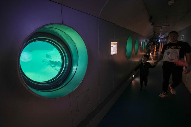 10月13日,游客在重庆涪陵白鹤梁水下博物馆的水下参观廊道内参观。新华社记者 刘潺 摄