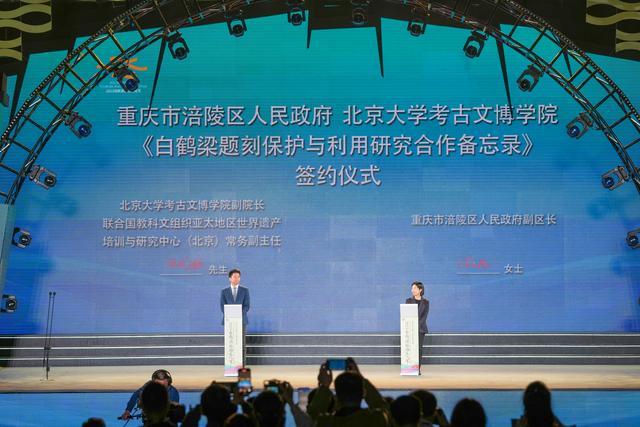 这是10月13日在重庆涪陵举办的2023白鹤梁旅游文化节开幕式上拍摄的《白鹤梁题刻保护与利用研究合作备忘录》签约仪式现场。新华社记者 刘潺 摄