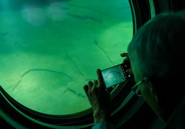 10月13日,游客在重庆涪陵白鹤梁水下博物馆的水下参观廊道内通过观景窗拍摄保护罩内的白鹤梁题刻。新华社记者 刘潺 摄