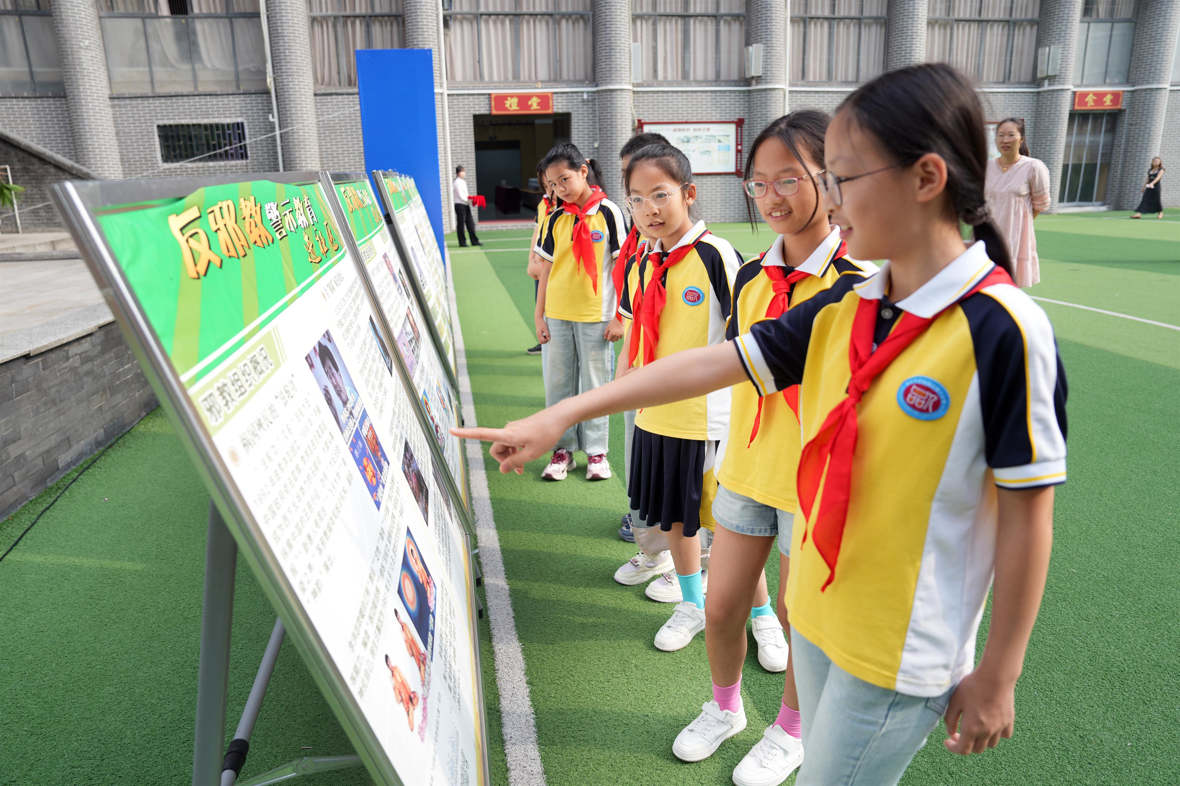 学生观看反邪教知识展板