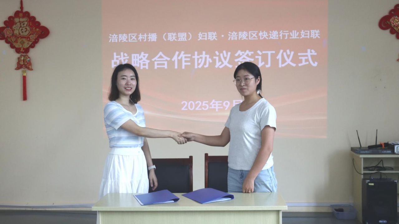 随后,涪陵区快递行业妇联与村播(联盟)妇联签署了共建战略合作协议。双方将整合“直播带货”与“物流快递”资源,构建“云端展示—田间直采—指尖配送”的完整链条,通过优化产销衔接、提升物流效率,为农产品销售和妇女创业就业提供全流程支持。