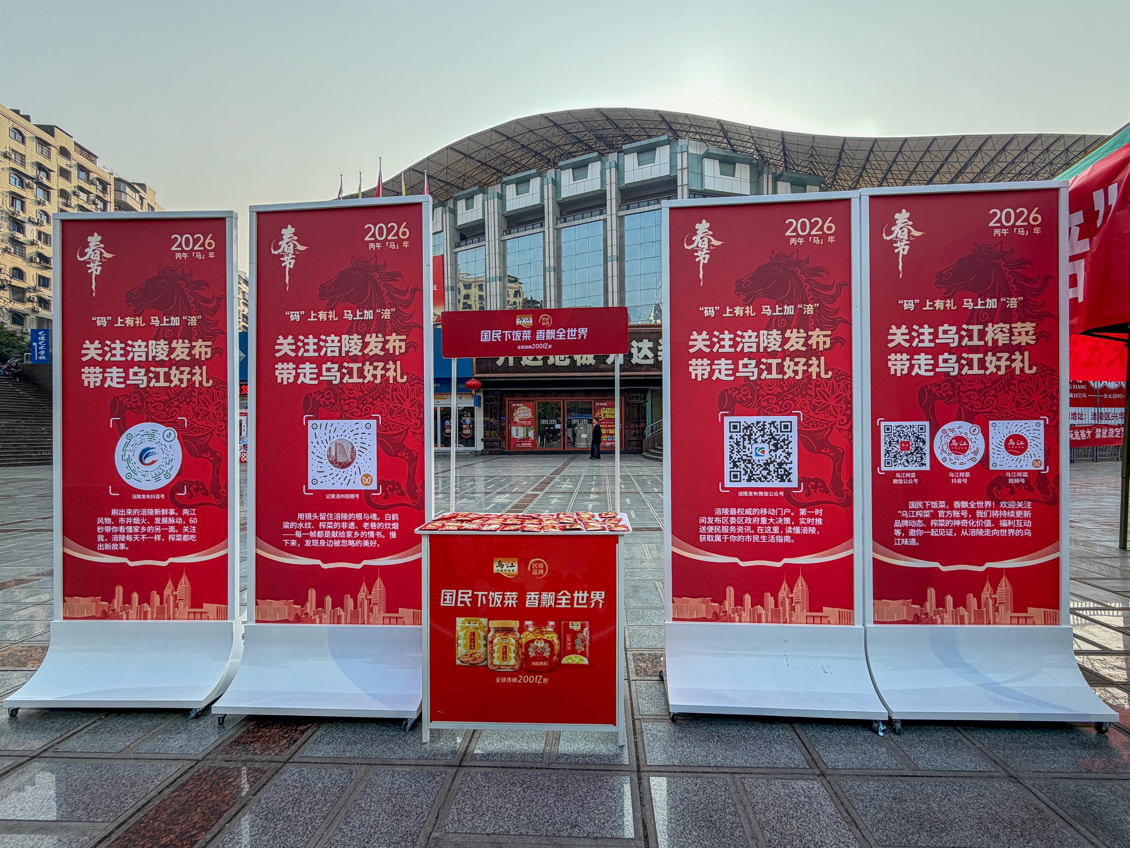 记者看到,现场设置了6个清晰的扫码指引牌,市民只需扫码关注指定6个平台,即“涪陵发布”公众号、“涪陵发布”抖音号、“记录涪州”视频号,以及“乌江榨菜”微信公众号、抖音号、视频号,即可分别领取到1袋乌江榨菜品牌的脆口榨菜芯,最多可得6袋。