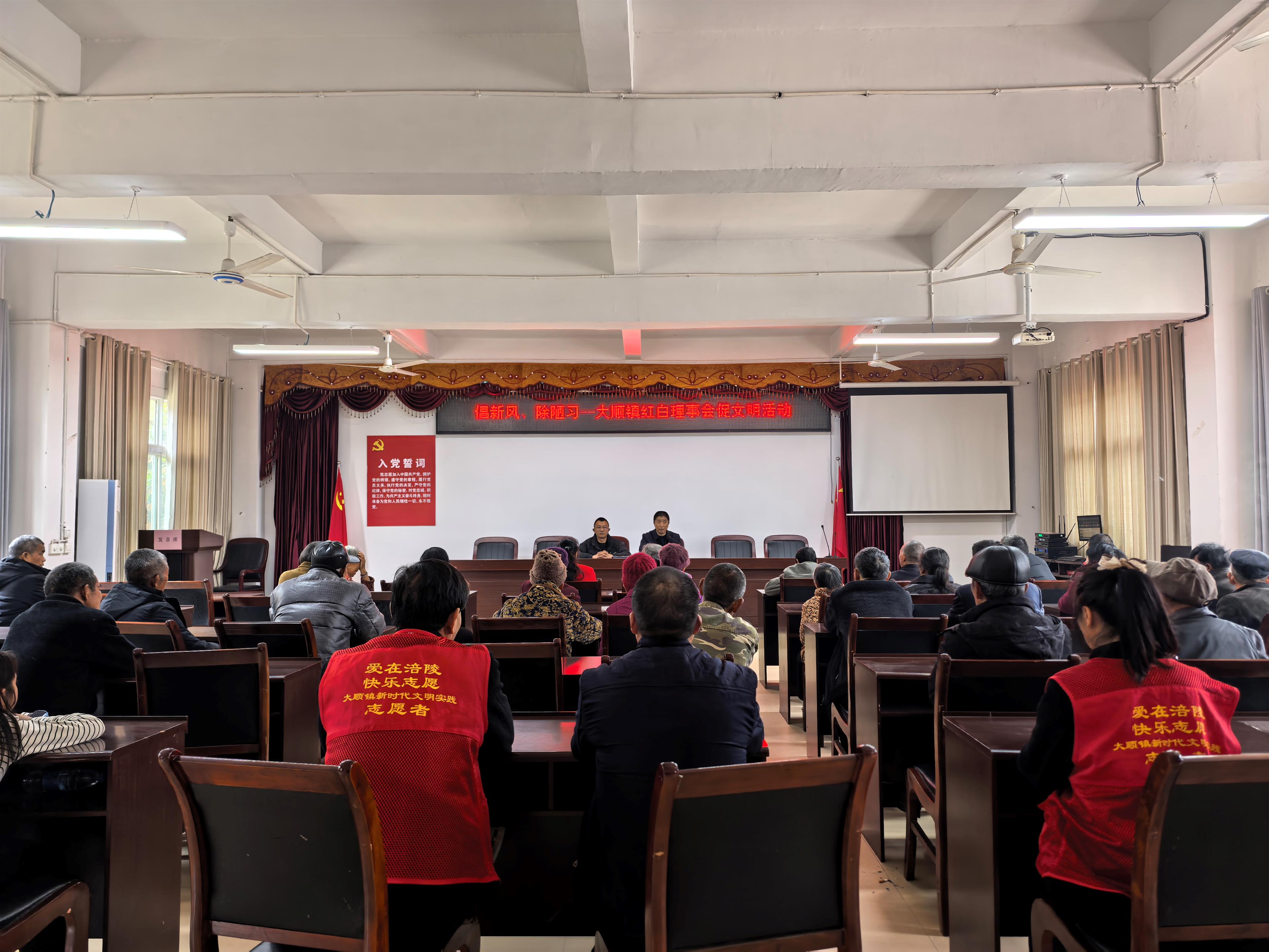 2月25日,涪陵区大顺镇在林和村组织开展“倡新风、除陋习——大顺镇红白理事会促文明”主题活动,充分发挥红白理事会的基层引导作用,通过宣传教育和志愿服务,引导村民破除婚丧嫁娶中的铺张浪费、盲目攀比等陈规陋习,树立勤俭节约、文明健康的生活方式,进一步涵育乡村新风尚。